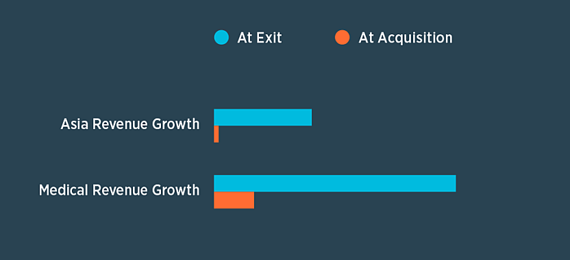 Blue Point’s Global Supply Chain team helped QSR hire a General Manager and sales representative in China, provided introductions and leads to local customers and helped develop standalone operations by adding local engineers and domestic tooling and material sources. Blue Point introduced a low volume concept into the Asian automotive, industrial and medical markets, to help overcome barriers to entry (i.e., high tooling costs). In result, QSR’s Asia revenue grew over 2000% from acquisition to time of exit.